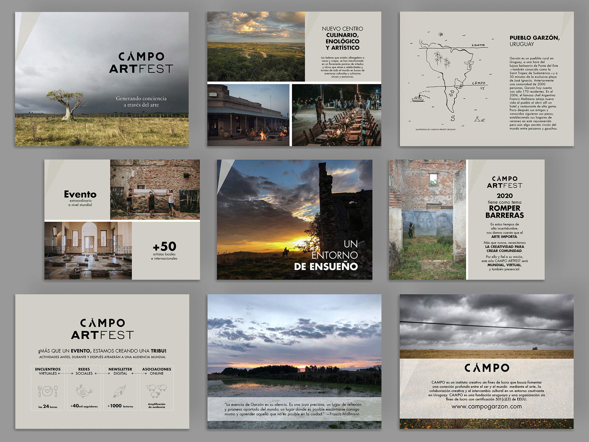 Sponsor pitchbook and event collateral for CAMPO ARTFEST, an annual art event organized by Campo Garzon, a non-profit creative institute based in Pueblo Garzon, Uruguay. Pro Bono client: Campo Garzon, Uruguay (2020)